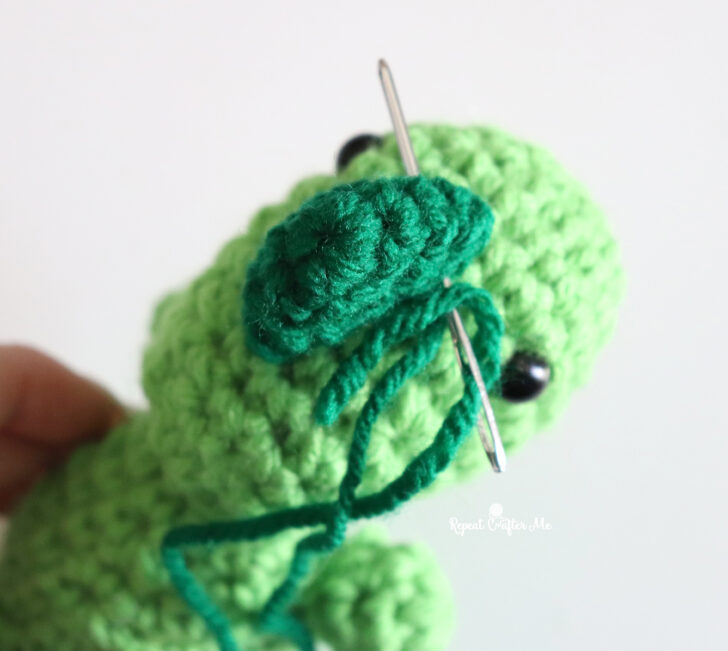 - Use a tapestry needle to stitch through both the edge of the spike and the stitches of the head
