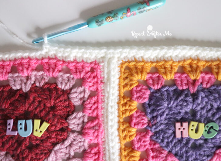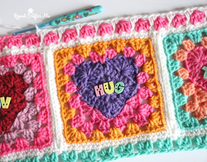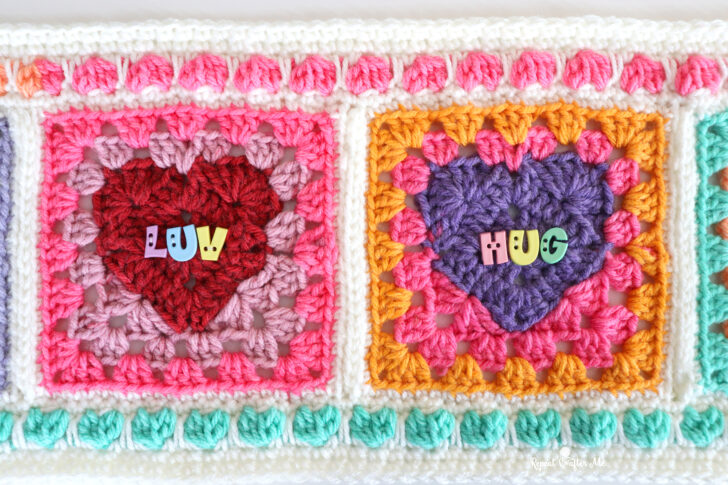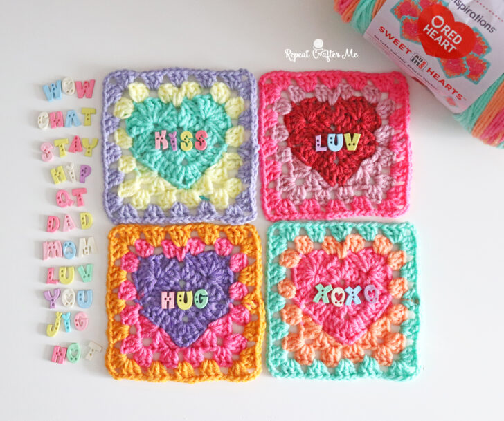 Then, I showed you how to turn those sweet heart squares into crochet conversation hearts, complete with fun alphabet buttons and nostalgic candy vibes.
