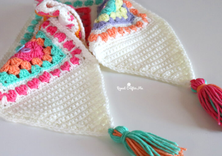Make two tassels using your Sweet Hearts yarn (I used Candy Hearts) and attach one to each pointed end.