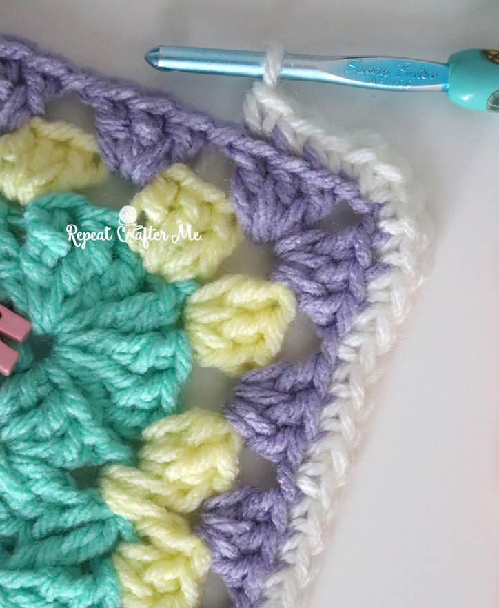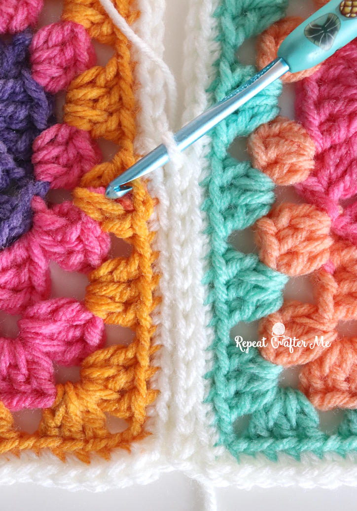 Using the same white yarn, join your squares using a slip stitch join, working through the back loops.