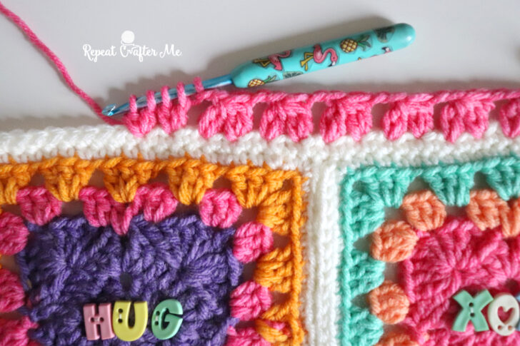Note: The HDC should be worked in the skipped stitch between the hearts — this helps anchor the hearts and gives the border a polished look.