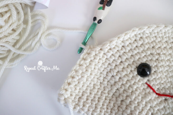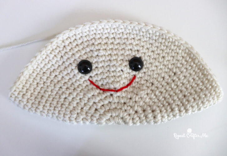 Attach safety eyes and stitch on the red smile to one side before closing.