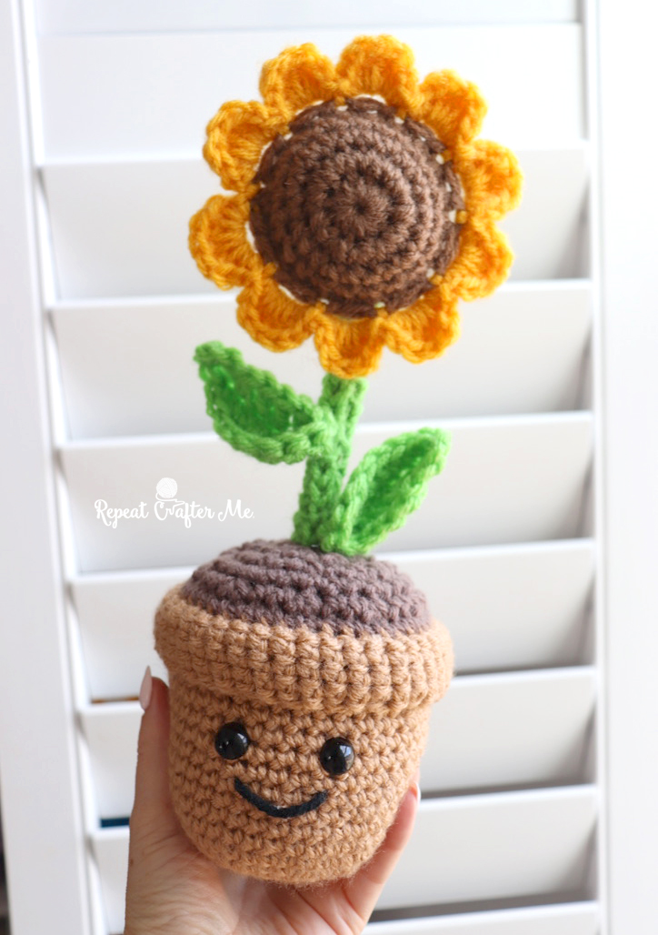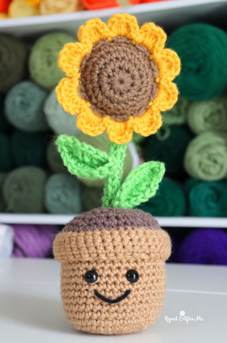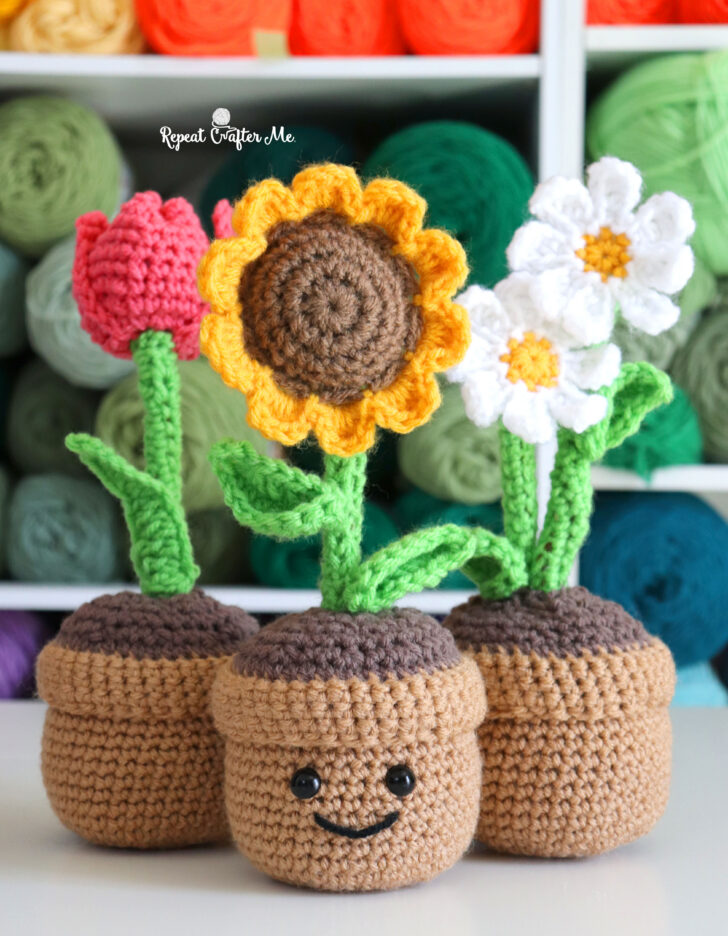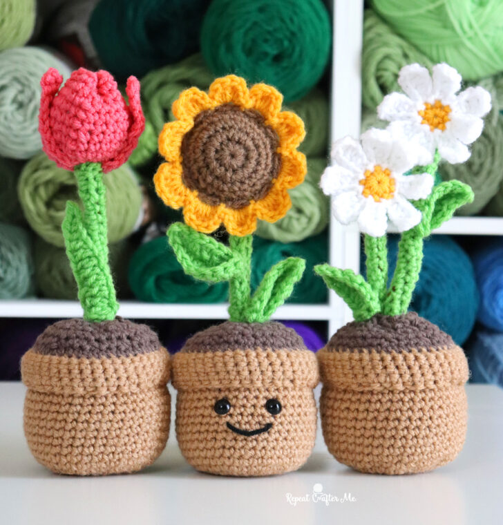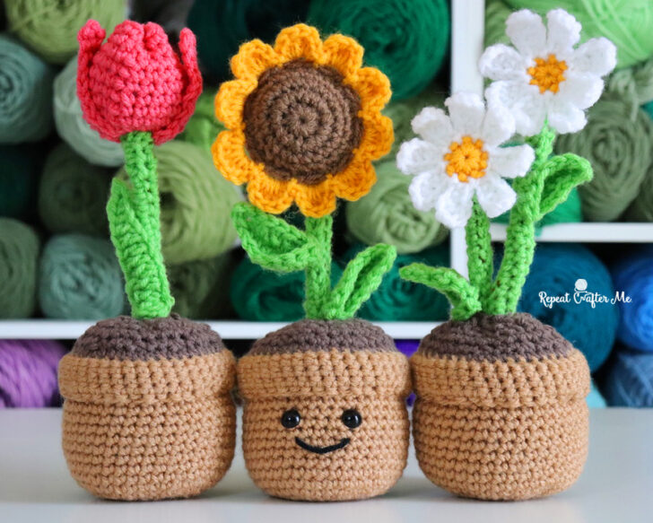 The flowers are from my Crochet Bouquet collection—perfect for gifting on their own or adding into this potted planter!