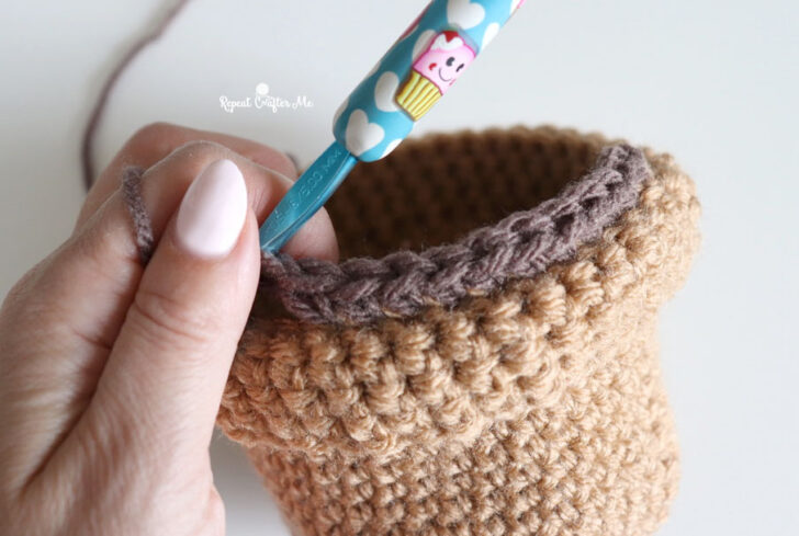 Round 23: Join dark brown yarn in the back loops of Round 19. SC in each stitch around, join, chain 1 (40 SC)