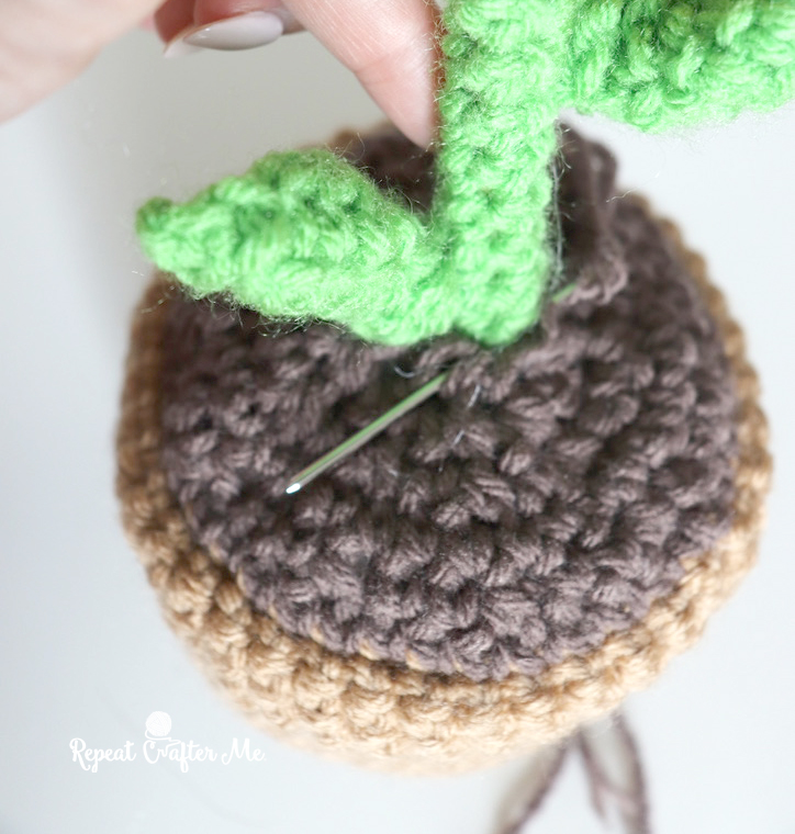 Using a tapestry needle, weave under the top front stitches to cinch the hole closed snugly around the stem. Stitch into the stem a few times to secure.